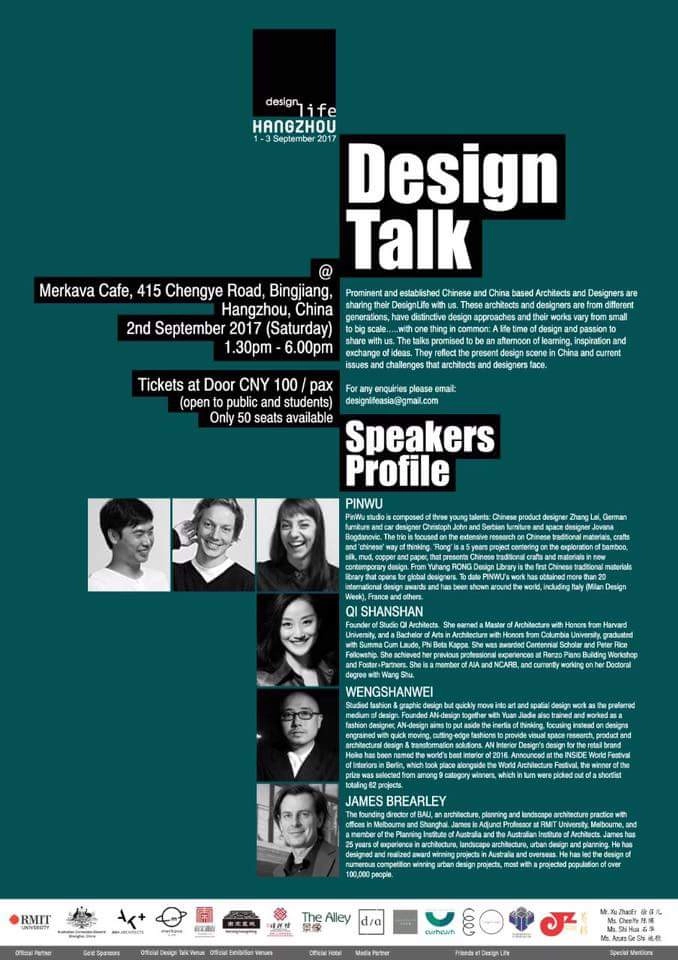 2017年9月5日,山山受邀参加杭州设计生活会谈 DESIGN TALK , 与其他五位设计师一起同大家分享了STUDIO QI作品、教学心得和四年来对设计和生活的感知。
