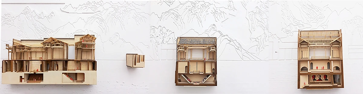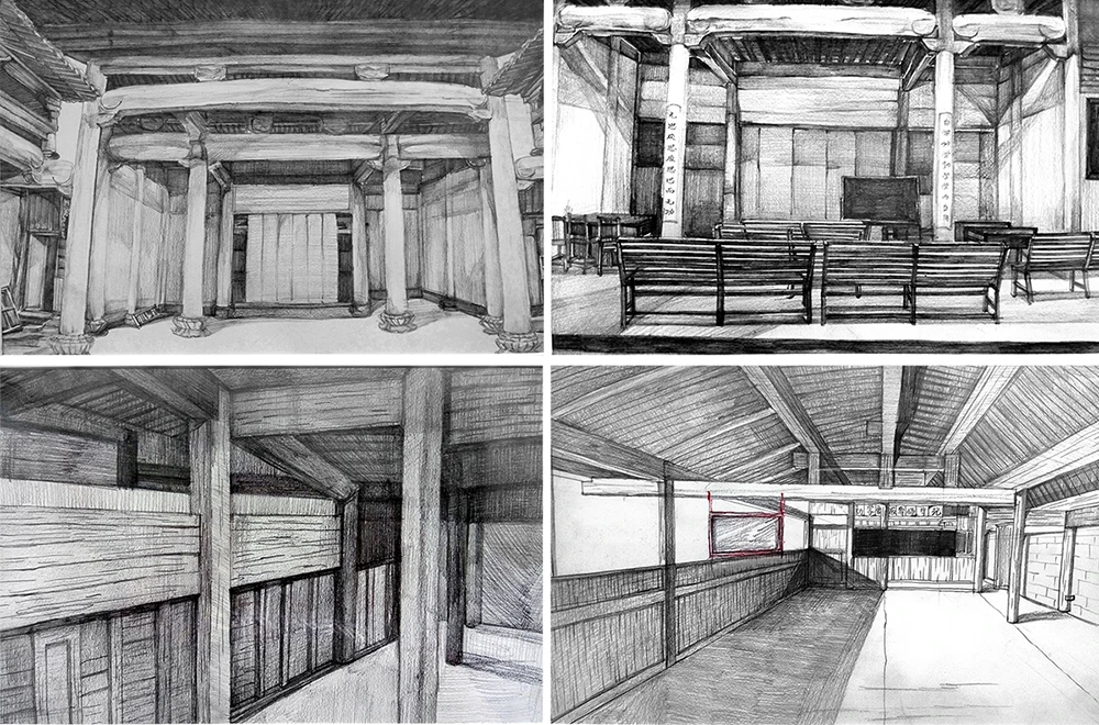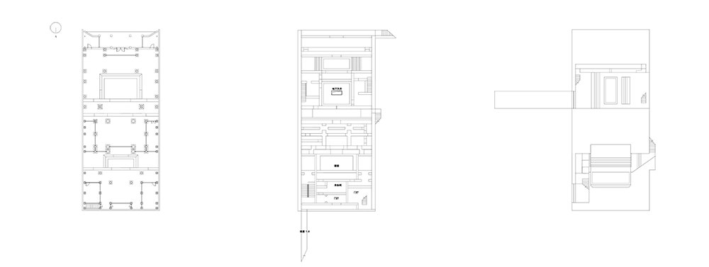 由祠堂正门进入,首先映入眼帘的是宏伟的木构。进入中堂,感受质朴的草架,天井的光线昭示着天地之间的对话。朝内进入第二进寝堂,这里原本是作为祭祀的房间,现在被改造成会议室而存在。寝堂的的东边由楼梯爬至二三层。这两层空间在整个祠堂破败之前被利用为教室,设计之后被作为展厅使用。展览的内容主要为文革时期的各种影像、图片、书籍等资料,希望通过这些令人了解这段历史。