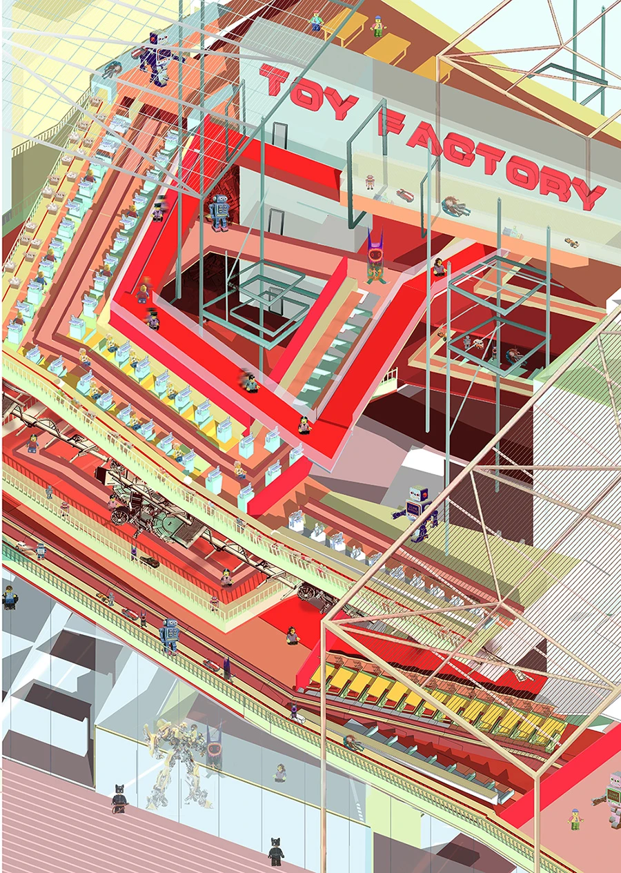 将游客与残疾人互动界面加入设计的考虑中,有意识的在功能上分离残疾人工作空间与游客游览购物空间,但同时提供交流互动的机会,让游客与残疾人在相同的环境下游览、购物,以消除残疾与非残疾的差异,使残疾人的“残疾”这一点难以区分,不被过分关注,建立平行的交流空间。体验一个全新的,对于残疾人来说“最具适应性”的正常世界,感受一个配合着滑道与玩具的儿童乐园。而我所讨论的错觉仿佛在此刻即像是消失了,却又是更加促使人反思“认知的错觉”。