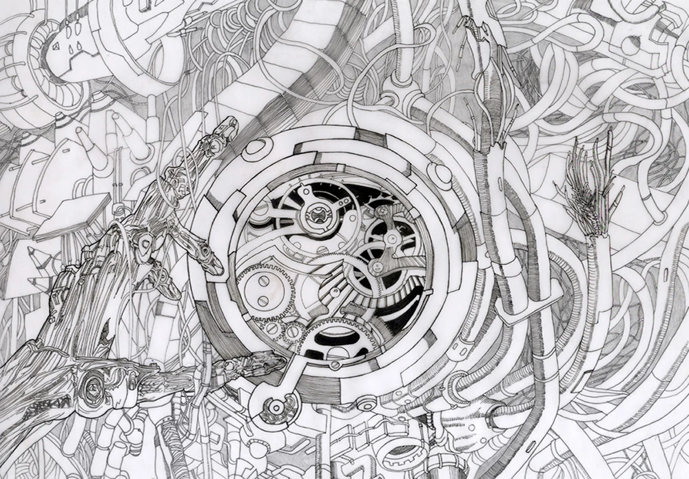《真实的虚构》这一组黑白线稿,用最简单的方式表达小说中主人公在现实世界中进行试验的场景。用最抽象的方式表达最贴近真实的场景,试图再次将观者带入认知的错觉。当熟悉的场景以变相的方式展示时,观者又往往会害怕承认现实。