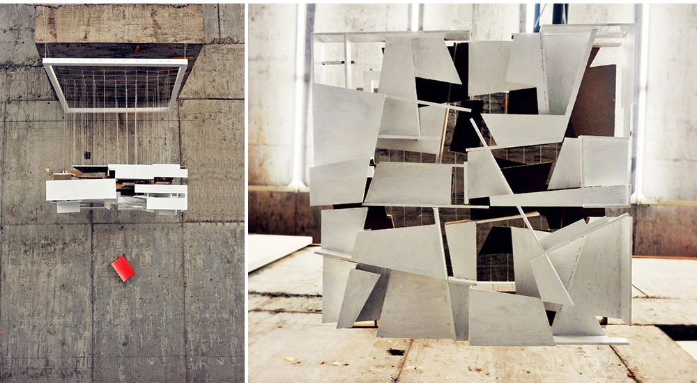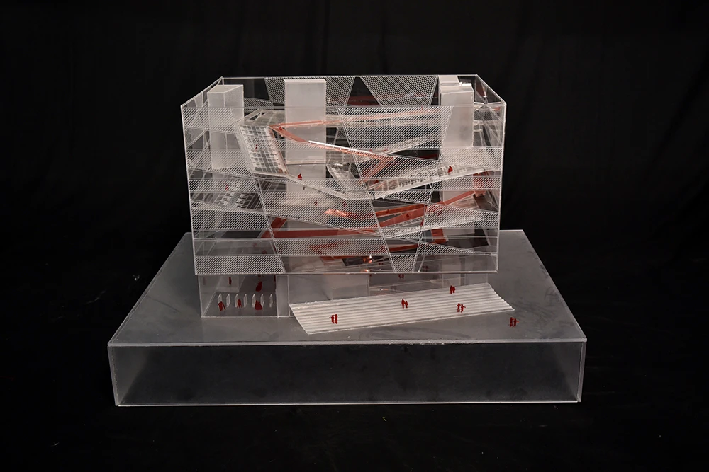 小说结构和绘画创作新颖独特,层次清楚,用第一人称阐释剖面结构;绘画反映体验认知的微观视角;装置带动建筑设计深入探讨和分析了残疾人建筑的可能性与社会关系结构。在创作的四个阶段都充满创意并有着出色的创作成果。建筑通过“倾斜”这一手法来控制好建筑设计非常规问题,研究深入,层次清楚,表达与表现力极强。