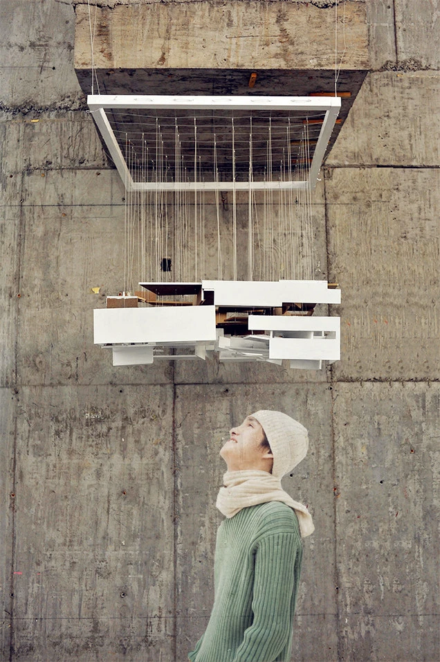“世界的缩影”被无数若隐若现的绳索拉扯悬挂起来,无论“世界的形态”如何变化,都无法摆脱这无形的绳索的牵引。这些牵制着你认知世界的条框,也许是他人的指引说辞,也许就是你自己的经验记忆。围绕“世界的缩影”走一圈以为能看清全貌,最终还是会回到你认定的正面,以为这才是最正确的观看装置的方式。装置本身被刻意压低,对观者产生无形的压迫感,迫使观者远离装置观看,却不曾试图靠近甚至进入。最终,你自以为了解了全部,殊不知,真正的世界在最不经意、最意想不到的地方 —— 头顶呈现出来。当观者发现和理解到装置中所展现的错觉以及自身理解的错觉后,惊讶的同时,进行自我反思,逃离自我与他人的牵制,摆脱认知的错觉,重新认识这个世界。