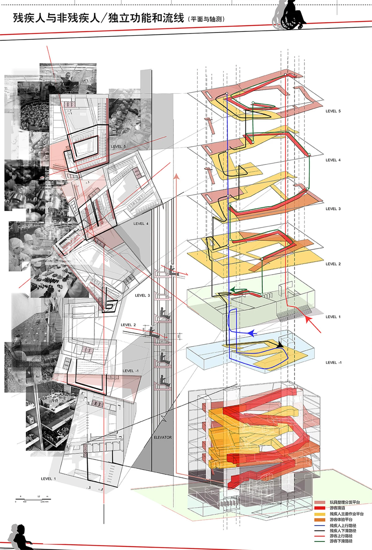 建立一个全新的,残疾人“最具适应性”的世界;一个配合着滑道与玩具的工厂,如同充盈着美好的儿童乐园。在考虑残疾人行为方式、工作方式、与游客的互动方式这几项设计原则下,以一种科学严谨的态度讨论建筑重点处理的三条流线关系
