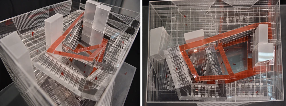 建筑空间设计以残疾人感知特点,独特的行为方式作为推动建筑生成的理论,试图建立残疾人与非残疾人的交流界面。以残疾人的身体尺度作为设计参照,以残疾人特殊的活动尺度作为建筑空间的尺度设计残疾人的工作界面。通过“倾斜”这一点来控制整个建筑设计。一是由于倾斜的空间可以使得下肢残疾的人自主移动,并且能加快生产过程中行动的速度。二是由于倾斜的空间会使人失去的对方位的判断,产生所谓的“错觉”。而其中此时的“倾斜”即是指滑道。建筑中运用到四种滑道坡度与工作活动的关系,滑道的组合都根据与坡度适应的工作于人体尺度呼应。倾斜的交通空间颠覆了“正常人”的前进与后退,上升与下降的移动方式。虽然残疾人的运动方式灵活性少于普通人,但由于坡道而产生的下滑加速度可以帮助残疾人更好的活动,更好地提高工作效率。通过连续、分割又交错的滑道空间,消除“残疾”与非“残疾的”之间的界限,重新定义“残疾人”的社会认知。