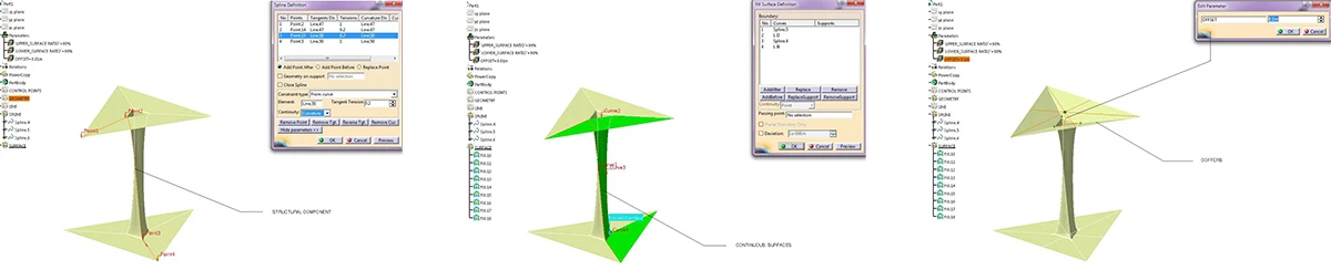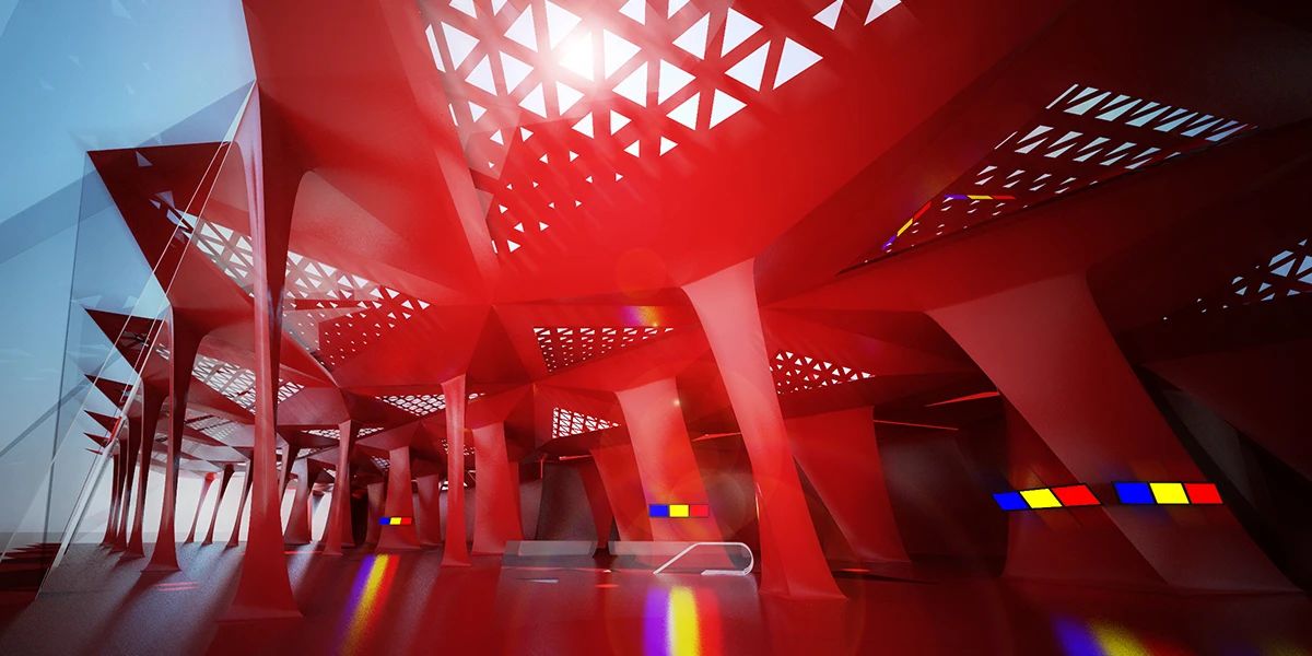 我们对罗马尼亚首都机场的设计抛弃传统参数化建筑设计的软件,采用了造飞机的软件CATIA。CATIA源于航空航天工业,被用于Boeing777飞机除发动机外全部的机械零件设计。它利用图形的几何关系及点云之间的关系法则对产品进行参数化的设计。利用CATIA不是为了使设计变得复杂,我们在这个设计里恰恰是通过对一个点和三条线的调整来控制结构的走向,设计变得简单化,而对于这样拥有庞大复杂功能和流线的建筑而言,越少的控制量也可以保证结构体之间的搭接越精确。通过CATIA,我们希望在多种形式与功能排布的可能中寻找一种合适的解决方案,不仅对飞机场这种庞大复杂的建筑有个宏观、理性的把控,更使之脱颖于传统的飞机场,在统一的设计语言下形成自己独特的性格。