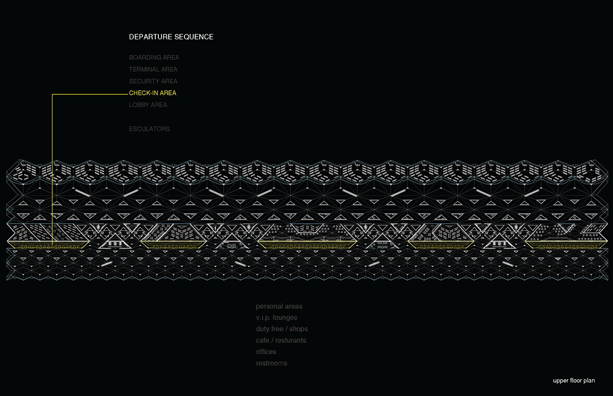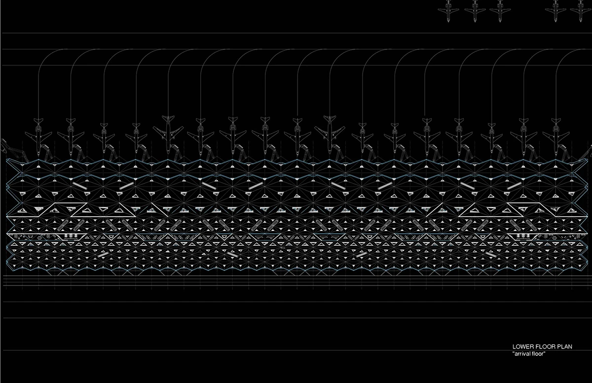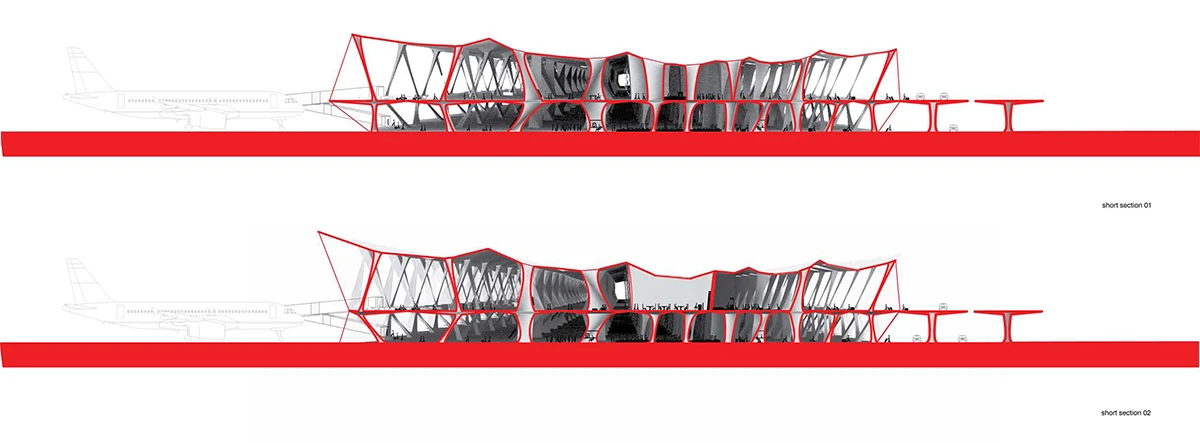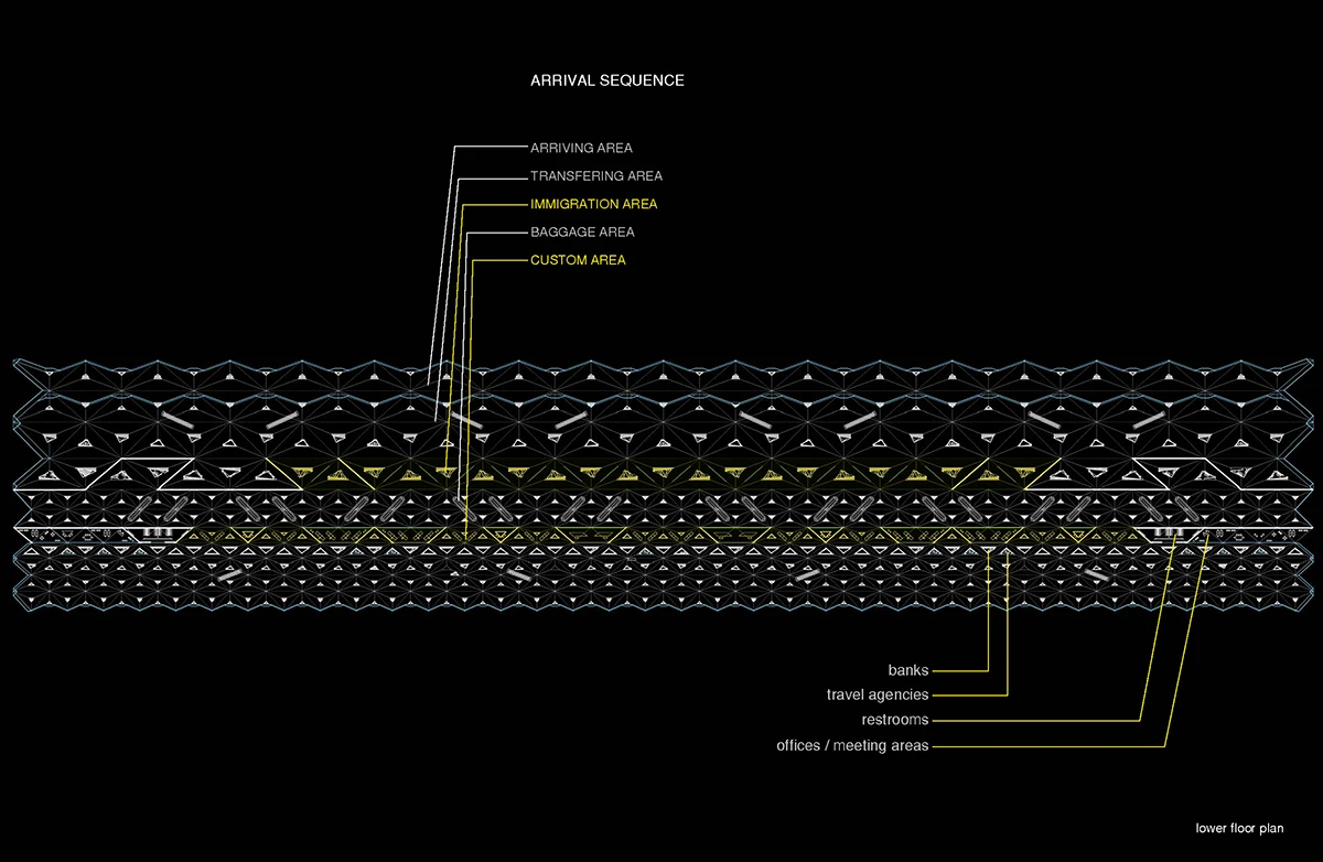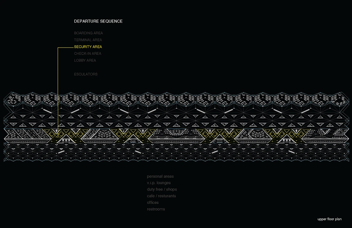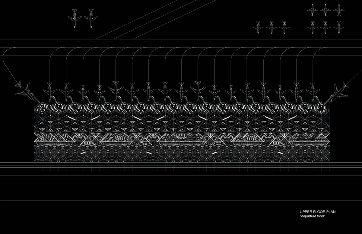 机场入口的空间由细柱形成,宽敞大气,迎接八方涌入的人群。往里走,细柱变宽形成一个个电梯厅满足垂直交通需求。渐渐的,通过形式挤压推动功能的衍伸,由柱子演变成的空间与墙体,在形成登记大厅、休息室等功能的同时,也使得入口开阔的空间向里渐渐紧缩,形成一条条较为狭窄的通道,这些通道恰好作为安检口,将去往不同目的地的人群进行有序的分流。过了安检口,结构单元的墙体又开始向中心缩拢,形成一个个较为私密的小空间,供等待登机的旅客作为休息室或者临时办公室。越靠近登机口,垂直曲面越向中心紧缩,最终在登机口的等候厅处这些结构单元又成为单纯的柱子,为机场留出开阔连通的大空间,以容纳等候在各个登机口的人群。