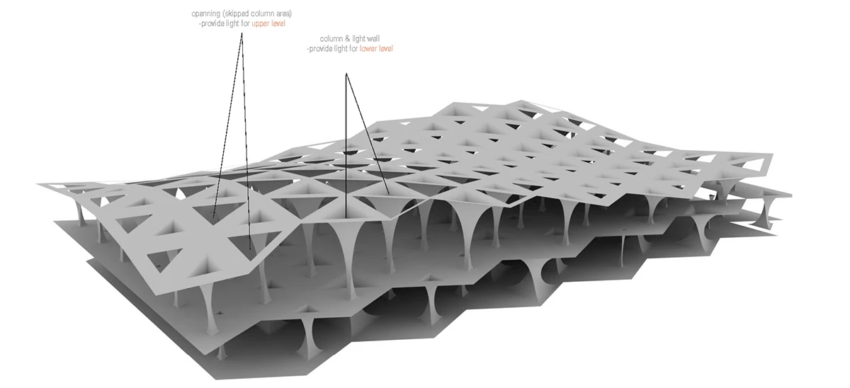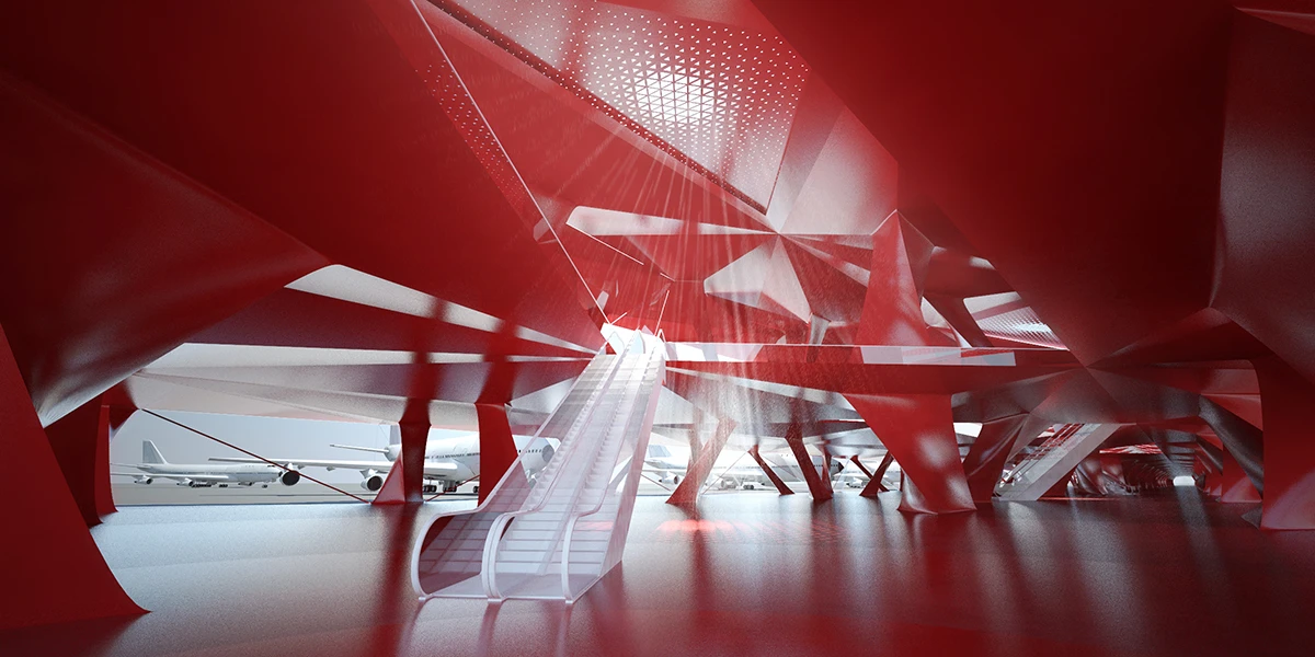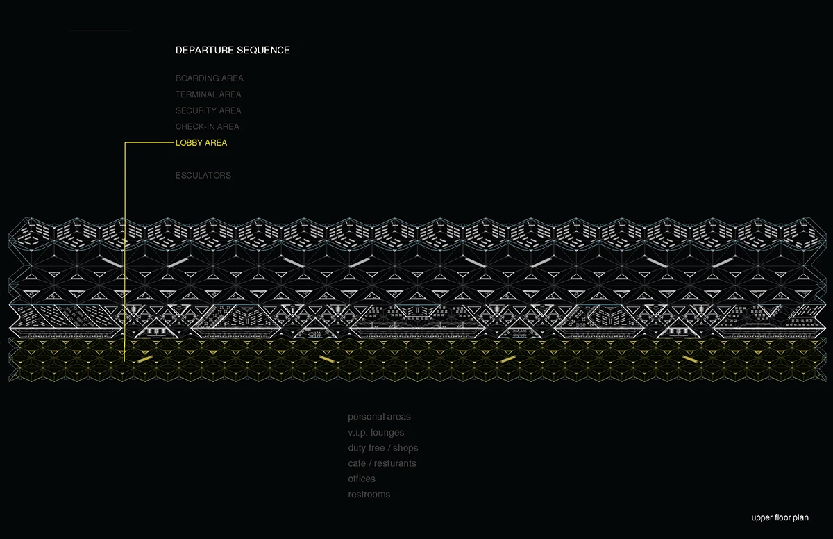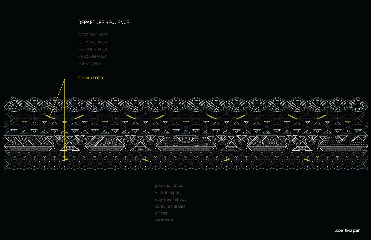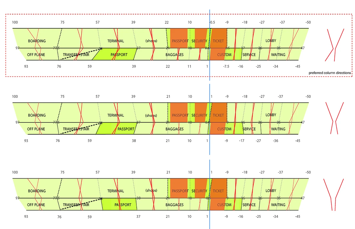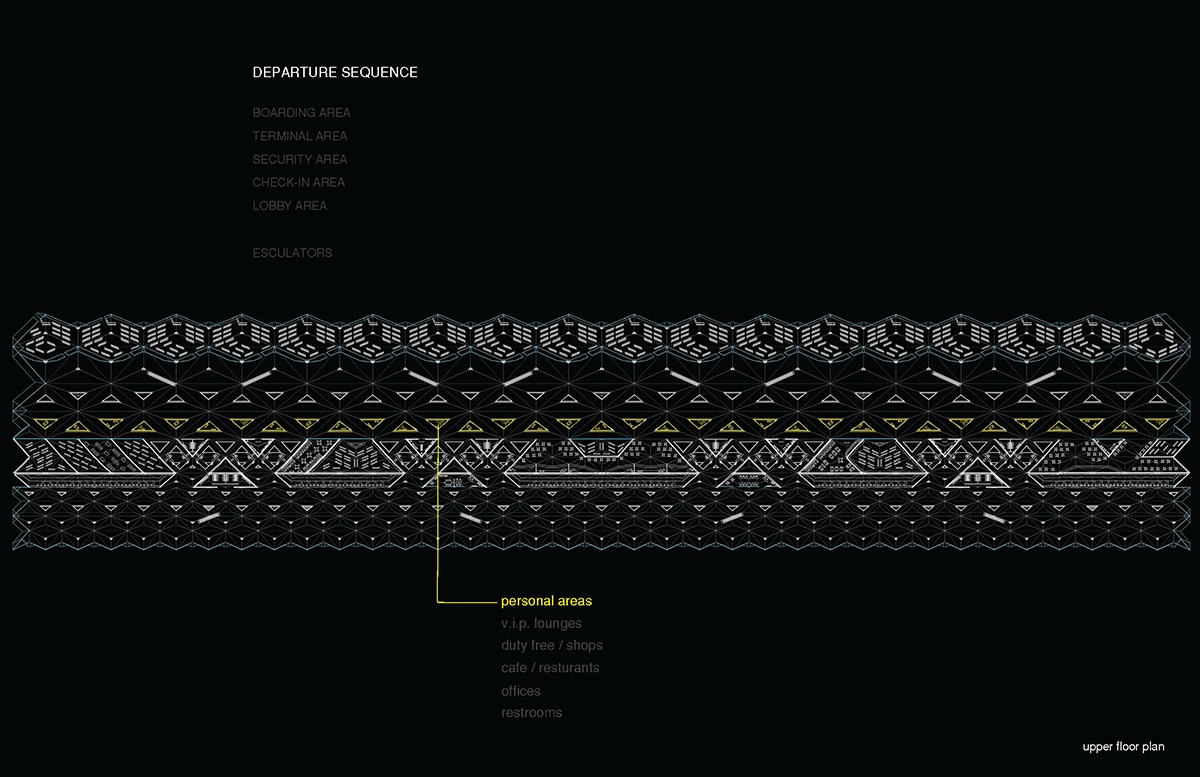 机场入口的空间由细柱形成,宽敞大气,迎接八方涌入的人群。往里走,细柱变宽形成一个个电梯厅满足垂直交通需求。渐渐的,通过形式挤压推动功能的衍伸,由柱子演变成的空间与墙体,在形成登记大厅、休息室等功能的同时,也使得入口开阔的空间向里渐渐紧缩,形成一条条较为狭窄的通道,这些通道恰好作为安检口,将去往不同目的地的人群进行有序的分流。过了安检口,结构单元的墙体又开始向中心缩拢,形成一个个较为私密的小空间,供等待登机的旅客作为休息室或者临时办公室。越靠近登机口,垂直曲面越向中心紧缩,最终在登机口的等候厅处这些结构单元又成为单纯的柱子,为机场留出开阔连通的大空间,以容纳等候在各个登机口的人群。