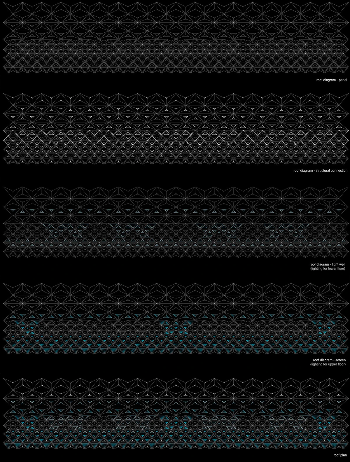 在控制点和控制曲线的基础上生成一个扭转的曲面,三个曲面拼合成上下三角形平面错位的结构单元体。不同于传统建筑结构竖向柱子受荷载作用再将力传递给水平楼板,该结构体由于单个曲面水平方向与垂直方向的错位,将通过水平牵引拉结来传递竖向荷载。这种受力形式相比于错位曲面的竖向拉结受力,可保证整体的楼板水平不弯曲。因为这种结构形式的出现,我们可以抛弃传统的钢筋混凝土,选取低密度高强度的高分子材料来搭建,使机场不再是厚重的庞然大物,而如同一个随时准备展翅翱翔的飞鸟一样轻盈。轻盈活泼的飞机场,也更适合作为呼啸于天际的飞机的栖息场所。