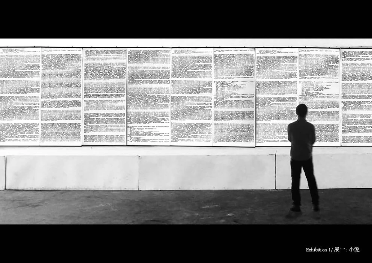而把小说作为一个展,又是对文字表达局限性的一次挑战,希望这个局限性的力量反向最大化。这里有40万字,密密麻麻的一字排开挂在墙上,它在形式上形成巨大的张力。踏进展厅,设想诸多的行为将会产生:瞥、看、观察、快速浏览或者猜测。然而小说内容只有在近距离阅读的条件下才能被认识。