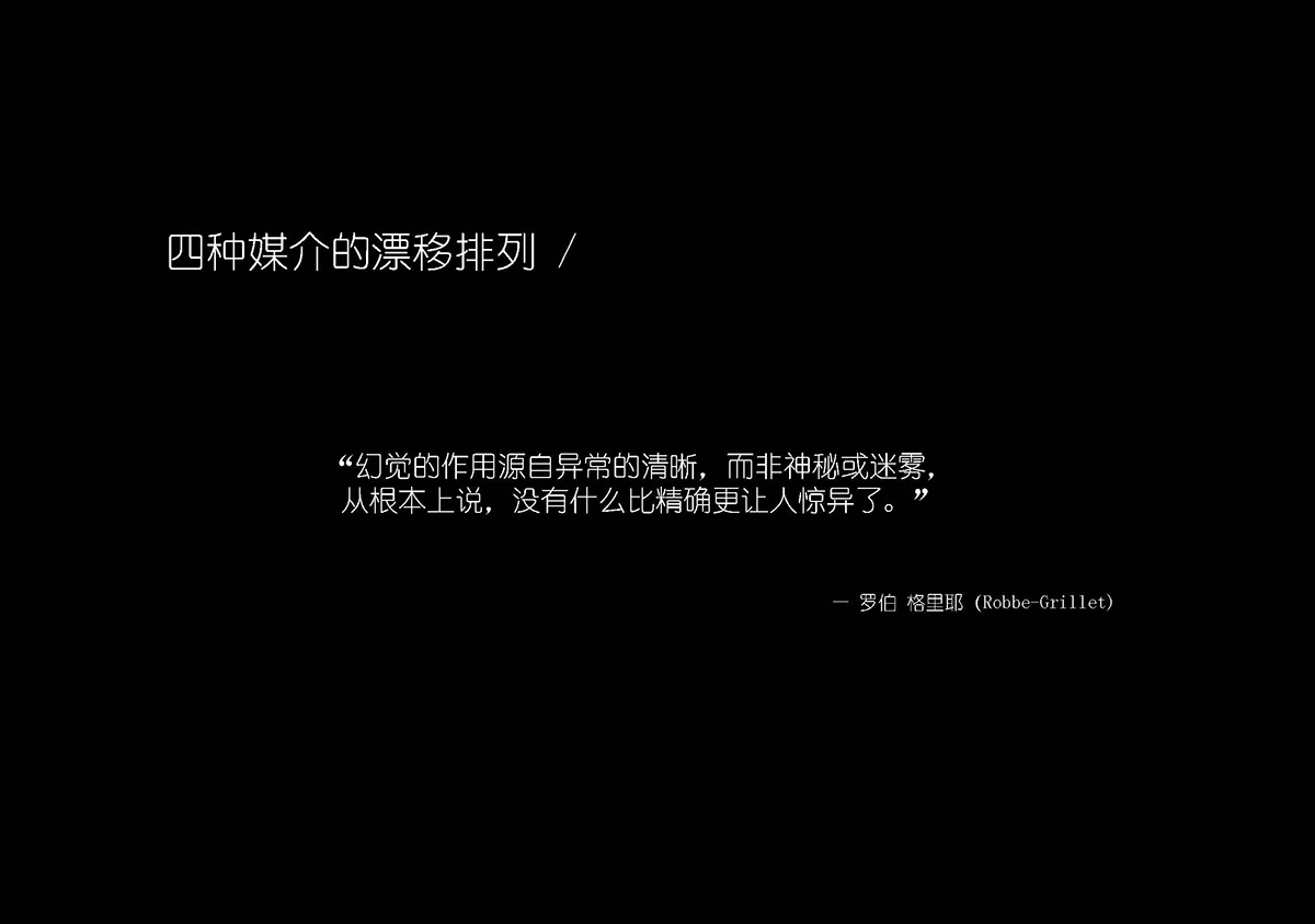 之上又是对「“另” 世界」的一次阐述,似乎这一年我一直在为这门毕设课的存在作说明和解释。然而,这并非我设想的全部。也就是说学生们热热闹闹的一年,可能只达到了课件设想中的一半。那另一半是什么呢?其实是课件里的第二部分,“另”空间,可能在课程中还未很好的涉及,就直接跳入了第三部分“表达的训练”了。先说一下“另”空间,之前“本我”的「“另” 世界」引发了一系列非常精彩的事件组合;而这些Events的交互交流构成庞大的关系体。运动事件被置入不同形式的秩序中,其中包括“非常规空间、突发性空间、之间的空间、流动的空间、展示与不被展示的空间、不存在的空间”等不被关注或者定义的空间。