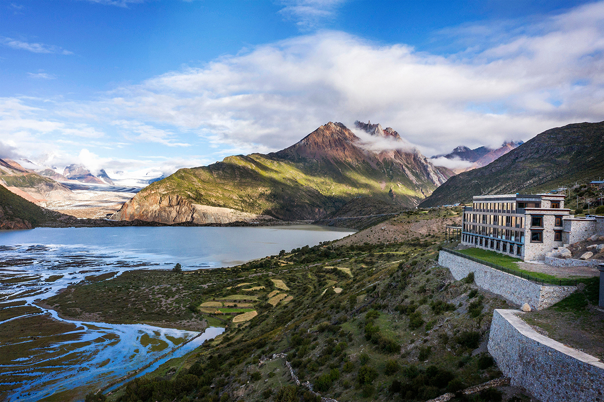 基地隔湖面向来古冰川(世界三大冰川之一),紧邻仅有20余户农家的来古原始村落,设计建造一个拥有20间房间的精品山居,一定也是隐在古村庄肌理中的。我们利用山体峭壁的陡势,将建筑置于其中,一侧是遥对来古冰川的四层玻璃幕墙的景观面,而另一侧则只露出一层脑袋,与村庄融为一体。