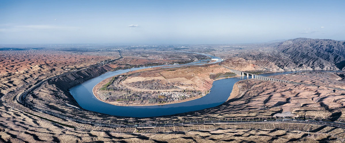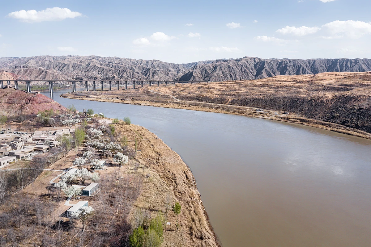 对岸,竖立着的是广袤无垠的腾格里沙漠,黄河就在人们眼前,围绕着场地流淌不息;向内是充满阳光的果树林子,枣树、梨树、苹果树… 地上落满了秋天的果⼦;而林子里面,片片水稻田安静的伏卧着。