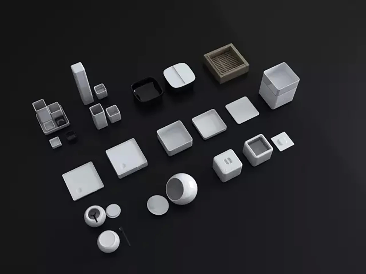 将空间规划理念微观运用,并借此尝试容器的组合尺度,对人的行为、食物,和空间视觉的影响。餐具主体由一系列相同模数的方碟组成,并根据所盛食物分为深、浅、平三种高度;辅助餐具外径取模数的1/2。其中汤圆碗作为唯一的非正交餐具(两个可相互契合成球型的圆碟,并以45°斜切,使两者均具有方向性和个性诉求)在理性规划的BLOCK中占据主体地位。当餐具陈列于桌上,餐桌被无形的正交轴线划分成等量区域,辅助区域则在更小的层级上被二次分割,不同餐品置于事先设计好的“规划区域”内,不仅在尺度把握上体现用心,更有“相配、适量”的膳食理念隐含其中。几何原理同美食逻辑完美暗合。