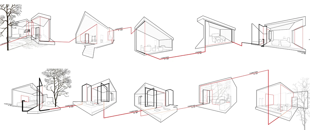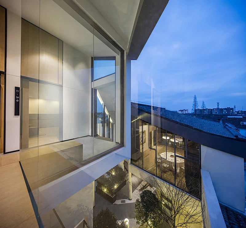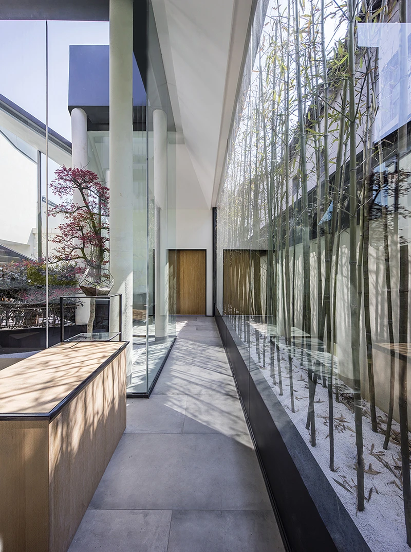 设计又植入了多重渗透的空间动态关联。创造了和柯林·罗的《透明性》(Colin Rowe’s Transparency) 一书中空间现象、事件、视觉、行为层面的共鸣,以及对于建筑的穿透力的思考。九舍的渗透性不仅是简单的玻璃透明,而是其正负空间的互动。人在此空间里,路径产生潜在的指引性,视觉有无形的穿透力,在不知不觉中,被空间影响,并参与了空间时间的形成。九舍就应该是这样一个面向社会的发生器。