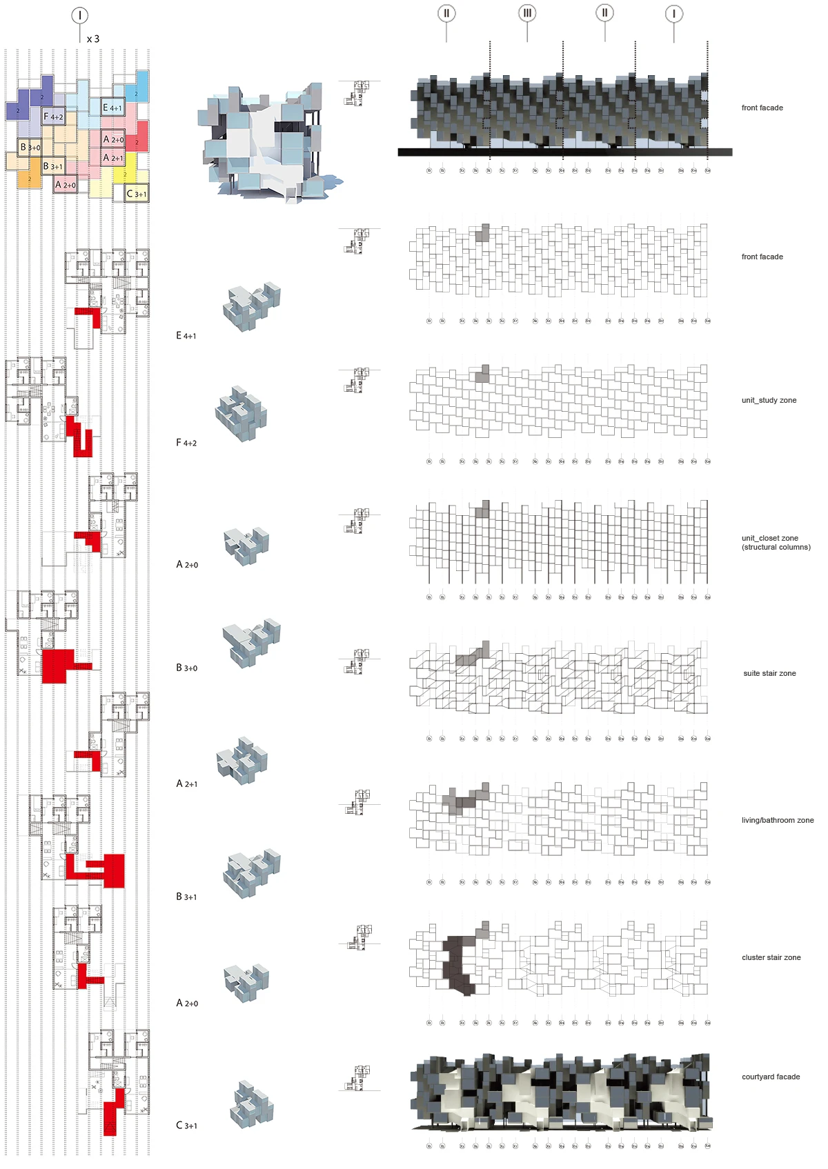 Unit围绕竖向的结构体错位咬合,每2到4个Unit通过不同的组织形态组成一个Suite,经过多次模型试验,我们得出7种不同的组织形态,使每一个Suite都具备独特的属性和丰富的空间。居住在一个Suite里的学生共享一个公共厨房、卫生间和休闲室,既能参与公共活动,保持与同伴的交流,又可以拥有只属于自己的私密空间,不被外界打扰。