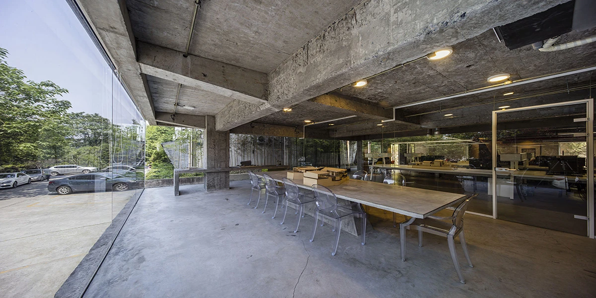 2014年12月15日,STUDIO QI 团队迁至于杭州西溪湿地旁的老和山山脚下,办公室由老电影厂房改造而成并由山山亲自设计。办公室被山下风景庇护在城市喧闹之外,外侧整体由全透明玻璃隔断,各时景致,尽收室内,创造了安静、促发灵感的设计环境。