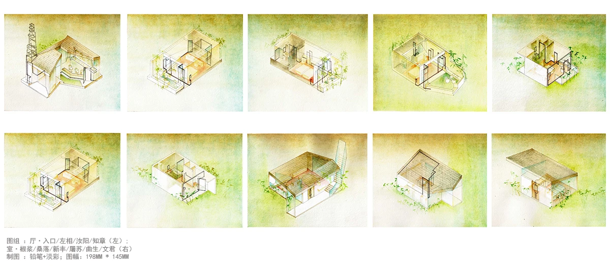 《画卷》利用手绘几何建筑剖面镶嵌庭院桥接建筑体块,详细的透视表现手法组织画面,展现出设计过程中对于不同空间的聚合、分散、错落的逻辑和实景空间关系。它将重新思考后的古典庭院特征“移动空间布局”及立体空间体验以抽象连续的场景形式表达出九舍正负空间交错、建筑布局促动,极度压缩又突然释放的空间兴奋点。《画卷》突出了所处在的西塘古镇其自有的城镇风貌和文化意境,也同时表达出针对建筑空间内的聚集、隐私、环境乃至聚落的复合性理解,整体配以明黄色背景,黑白与彩色的碰撞,抽象中不失灵动活泼的元素,空间中流露出时间的推进,静止的画面中不乏动感的韵律;动中有静,静中有动。人在观画的同时便能身临其境,从画面感知九舍这一组连续而正负交错的非线性空间的理念及其所折射出对生活百态的认知。《画卷》不仅仅是九舍精准而巧妙的建筑分析图、具有感染力的手绘渲染图,更是一张张透漏着设计感、意境感和体验感的艺术画作。
