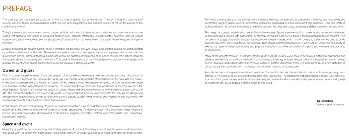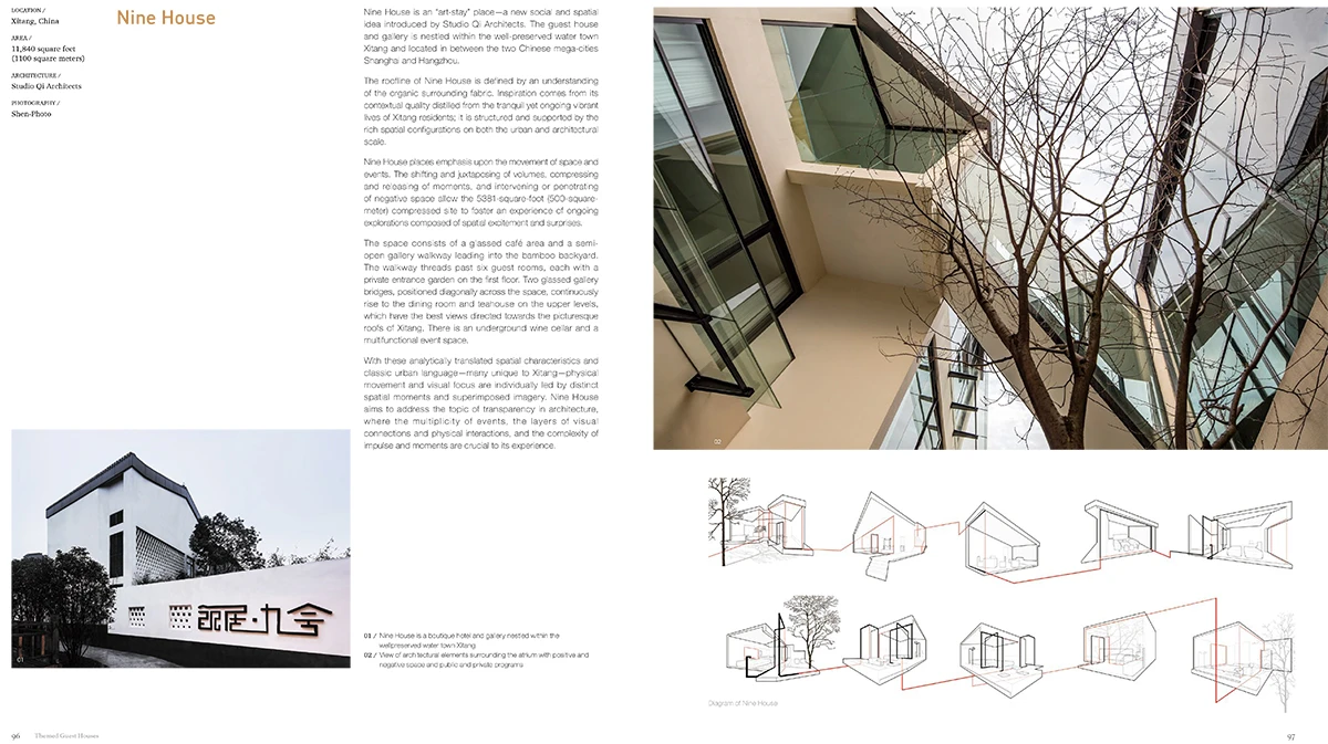 山山主编的 《Contemporary Guest House Design》 与中文译本 《民宿最美》 由澳大利亚 IMAGE PUBLISHING 出版发行。STUDIO QI 的代表作品「饮居•九舍」亦收录其中。