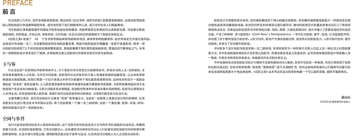 山山对民宿的认知有着自己的理解和看法,并在前言中对民宿本质“主与客”的关系和设计过程中“空间与事件”的构想进行探讨。